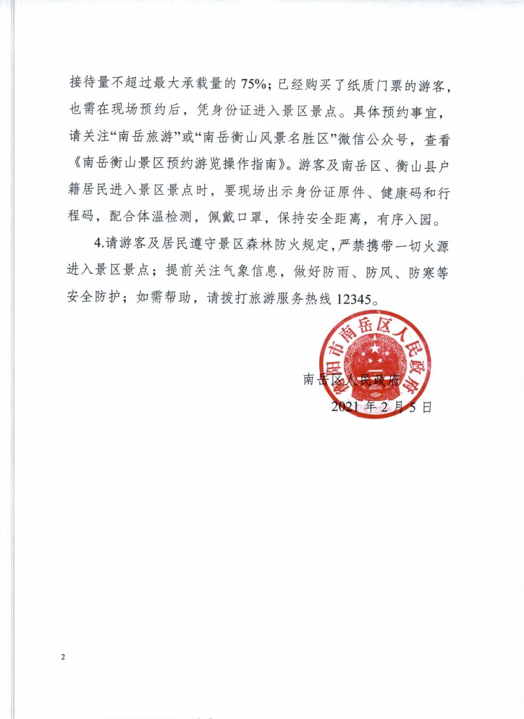 1.南岳大庙、祝融殿等室内型景区景点自2021年2月10日(农历二十九)17:30起,暂停对外开放,恢复开放时间另行发布。