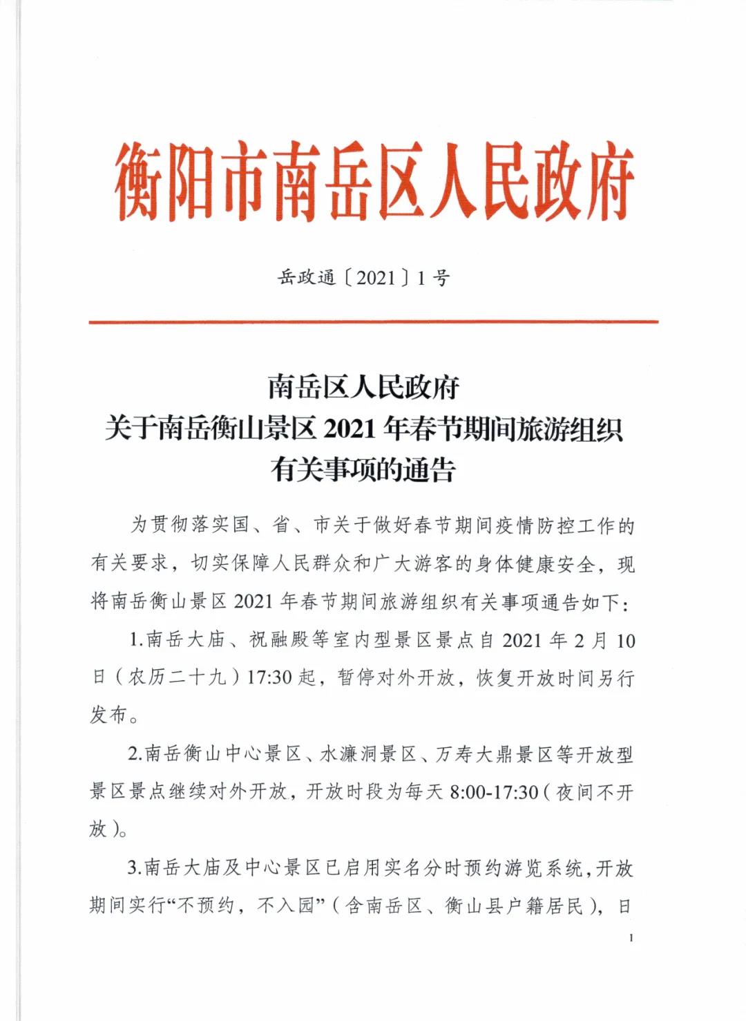 为贯彻落实国、省、市关于做好春节期间疫情防控工作的有关要求,切实保障人民群众和广大游客的身体健康安全,现将南岳衡山景区2021年春节期间旅游组织有关事项通告如下: