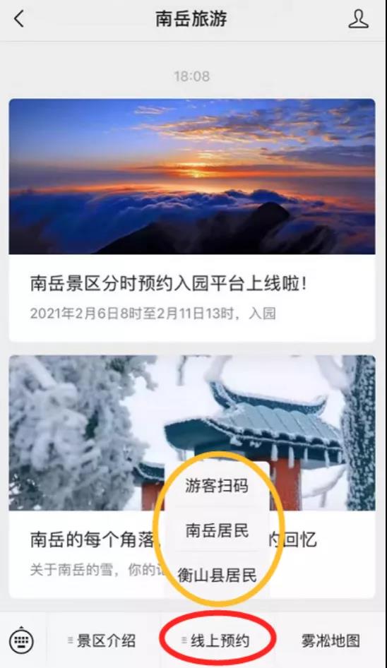 步骤二:进入公众号,点击“线上预约”菜单栏,根据情况选择“游客预约码”“南岳区居民预约码”或“衡山县居民预约码”