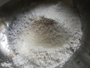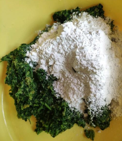 4、拌和将糯米粉1.5千克(3斤)和切碎的清明草倒入盆中,加入适量清水拌匀,揉成面团。