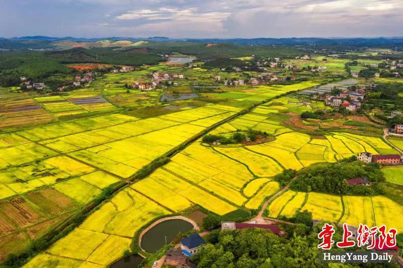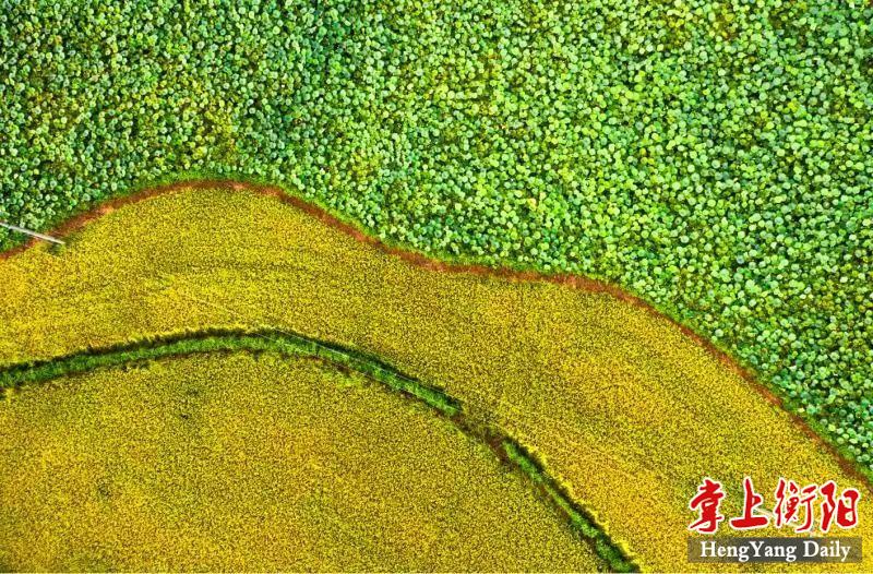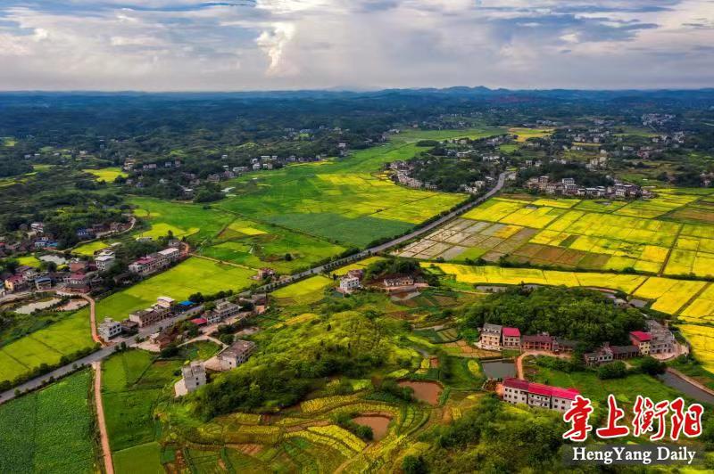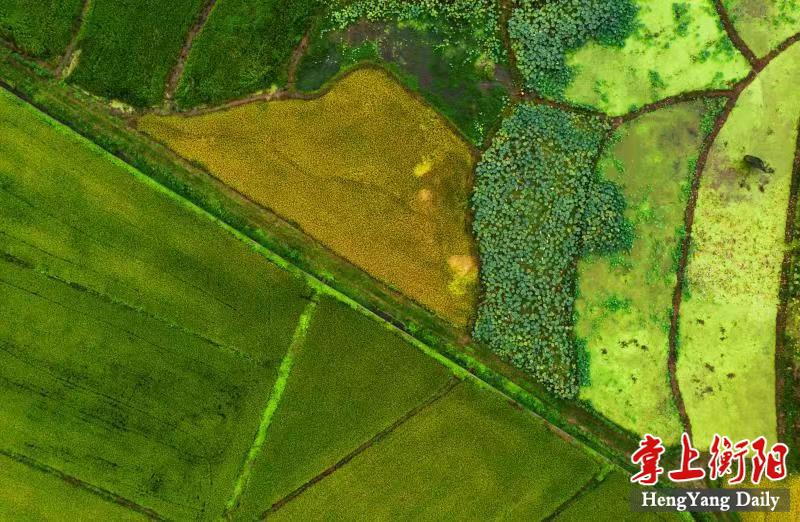 掌上衡阳客户端常宁频道8月16日讯(通讯员徐瑞东)    8月16日,暑去秋来,常宁市柏坊镇广袤的土地上,黄绿交错,色彩绚丽,宛如大自然的调色板。