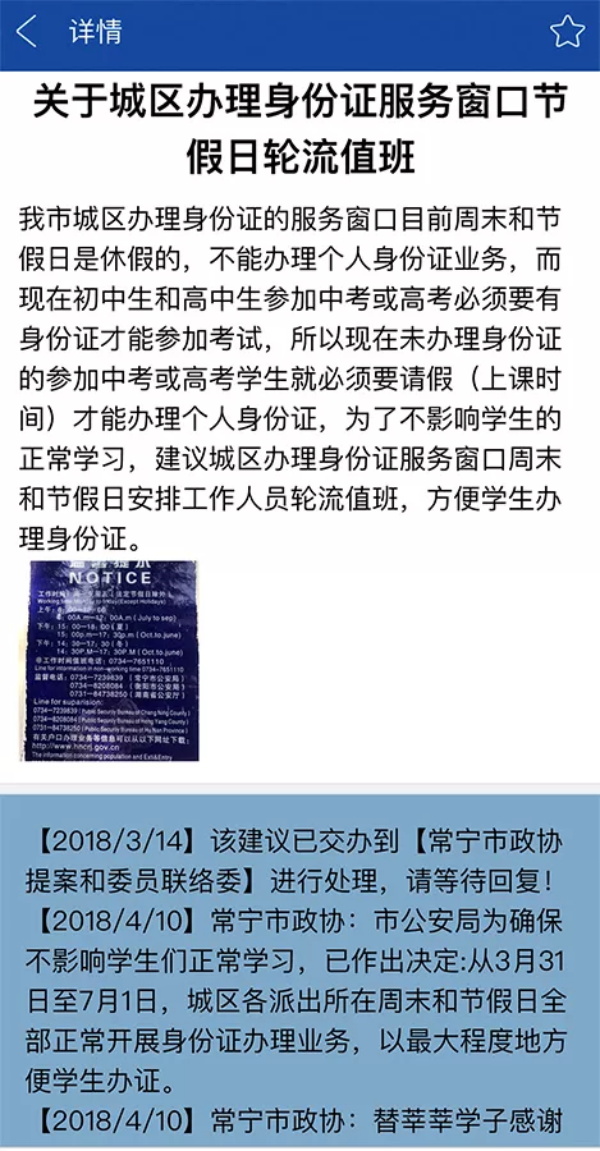 今年3月中旬,常宁市政协委员刘新志通过微建议反映,城区学生节假日才有时间去派出所办身份证,而节假日派出所却无人值班。
