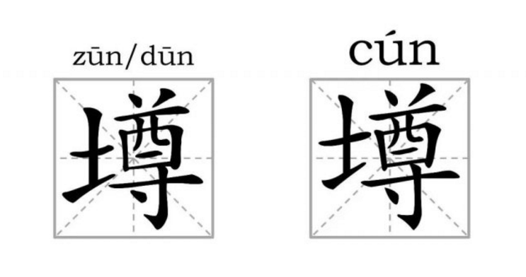 左边的墫部首是“土”,读z ū n时,古义同“樽”,酒杯;读 d ū n 时,古义同 “蹲”。右边的壿 部首是 “士 ”,同蹲。