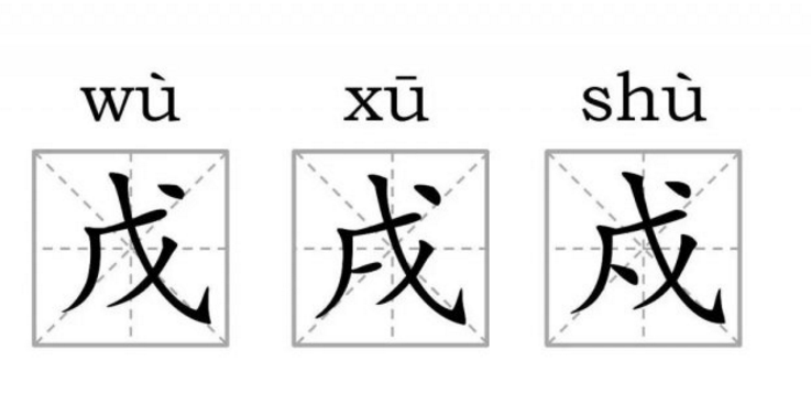 左边是戊,天干的第五位;中间是戌,地支的第十一位;右边是戍,军队防守。
