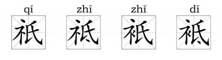 左一是 祇 ,古代对地神的称呼;左二是祗,恭敬;左三是衹,同“只”;左四是 袛,短衣。